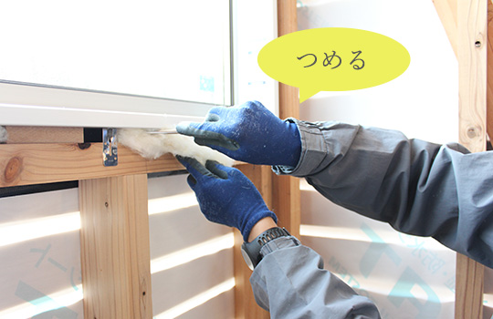 特に建物の隅部分や開口部廻りなどは断熱欠損が発生しやすいので、ウールブレスを充填するようにして下さい。